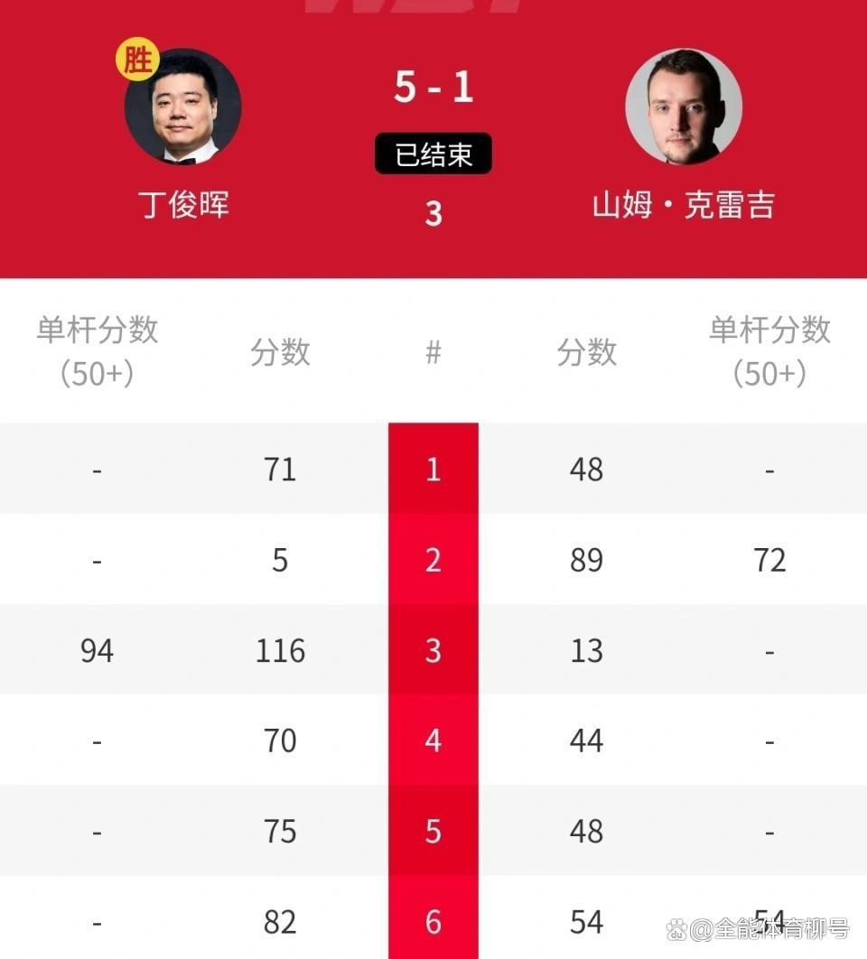 这场比赛第一局,丁俊晖与克雷吉张开拉锯战,胶著的比赛中,丁主任通过几次上手,71-48先拔头筹,1-0迥殊。第二局,克雷吉打出单杆72分,89-5扳回一局,比分追成1-1。第三局,丁俊晖回敬单杆94分,116-3温暖赢下,2-1再次迥殊。